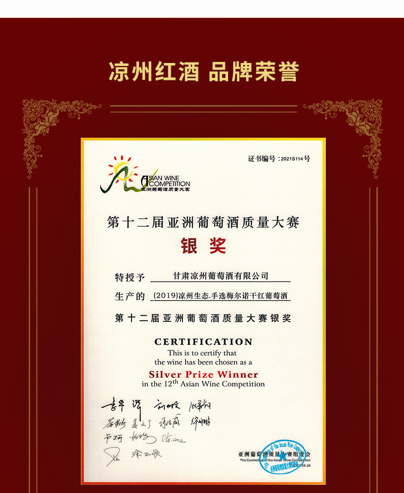 酒品名稱:涼州生態(tài)手選·梅爾諾干紅葡萄酒