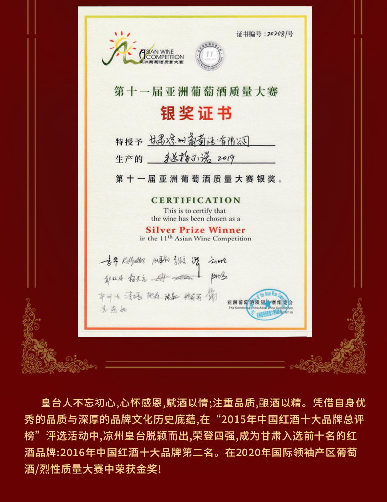 評(píng)語:酒體柔和圓潤  酸味舒適平衡