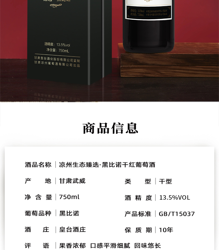 酒品名稱:涼州生態(tài)臻選·黑比諾干紅葡萄酒