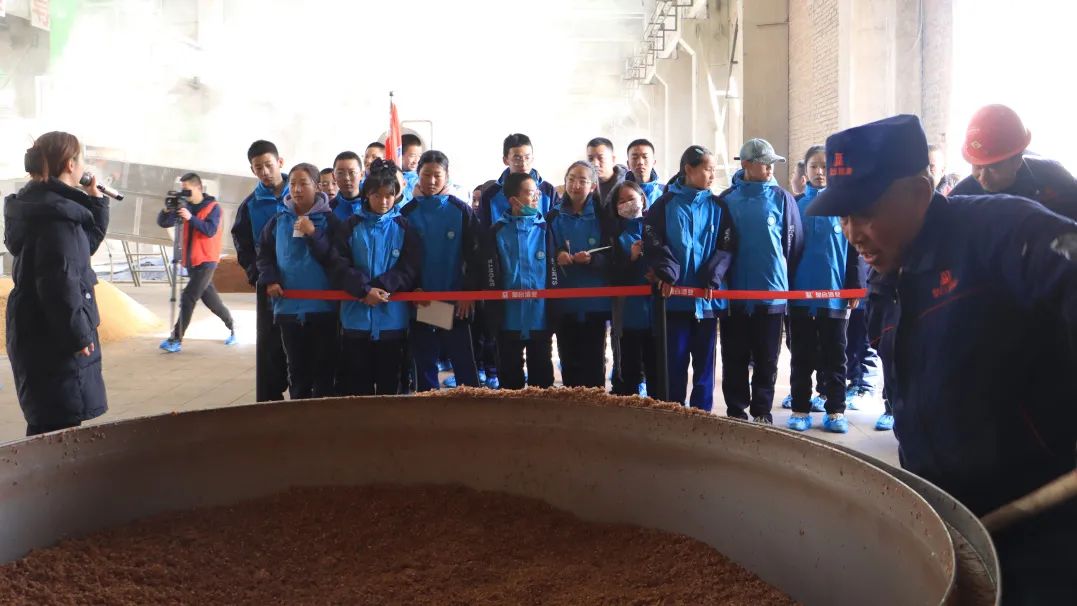 在白酒釀造車間,師生們近距離地觀察了從原料篩選、釀造、發(fā)酵到蒸餾的整個(gè)釀酒工藝流程。同學(xué)們聚精會(huì)神地聆聽(tīng),對(duì)白酒蒸餾與發(fā)酵這一概念有了更為直觀和深刻的理解。