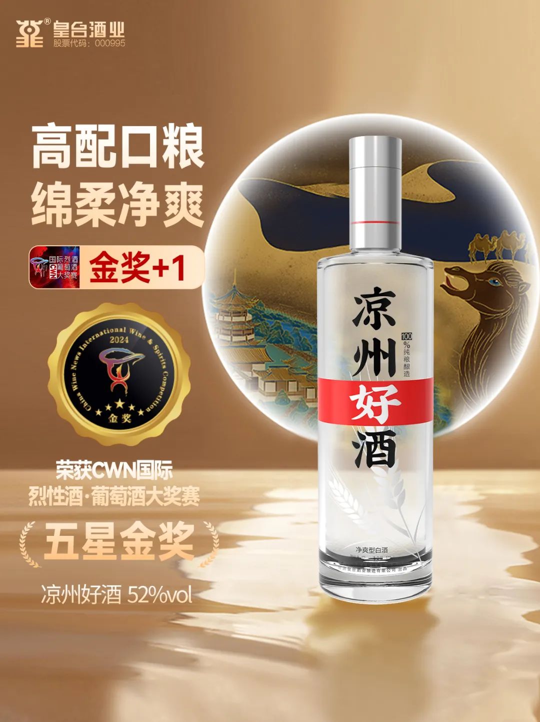 在第二屆CWN國際烈性酒·葡萄酒大獎賽頒獎盛典上,52度涼州好酒在烈性酒A類(價格在< 200元組)榮捧金獎;52度皇臺窖底原漿12和42度窖底原漿18兩款產(chǎn)品在B類(價格在<200-499元組)中榮捧金獎;52度皇臺窖底原漿18在C類(價格在500—799元組)中榮捧金獎。